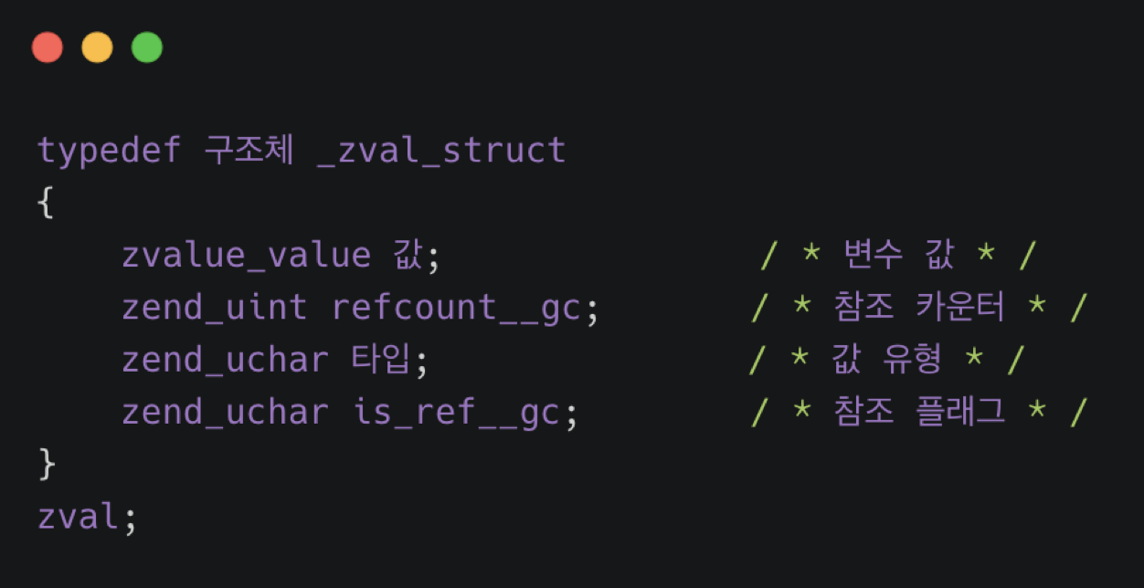 PHP 5.6에서는 zval 구조체의 크기가 24 바이트입니다.